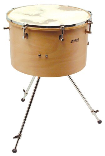 By Sonor. 16" diameter rotary timpani with a genuine calfskin head, wood shell, and proven central tuning mechanism; range approximately E-c (2 E's below middle C, up to C below middle C). The technical advantage of Sonor timpani lies in the unimpeded transfer of vibration from the head to the shell. The design of the Sonor rotary timpani is based on nearly 100 years of experience by Sonor in the construction of timpani. Mallets sold separately. The legs of the drum are height-adjustable; the lowest setting is at approx. 24-1/8" total height (from the floor to the top of the drum), and the highest setting is at approx. 35-3/4" total height.